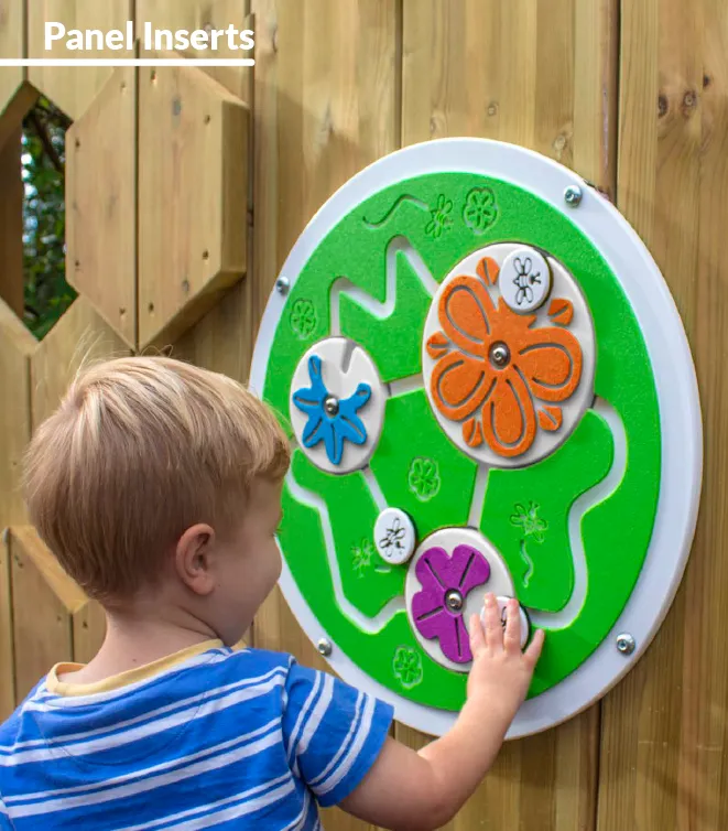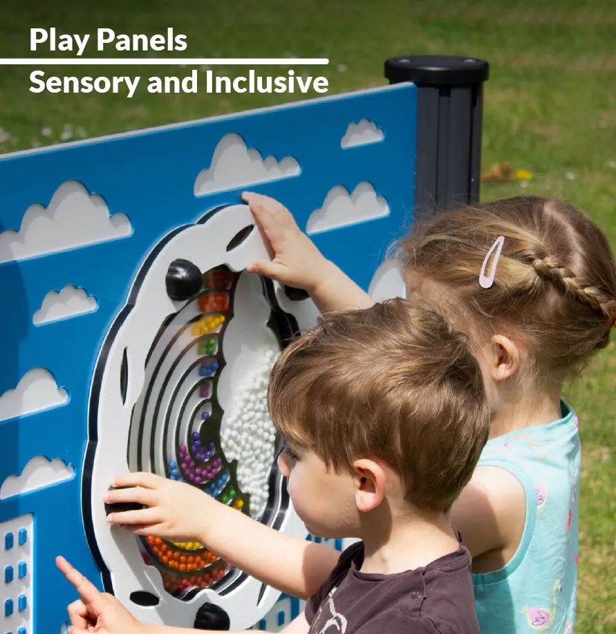 Sensory Play Panels for playgrounds, featuring moving parts, provide tactile, visual, and auditory stimulation. They are designed to be engaging and fun for all children, including those with physical, mental, and learning disabilities.